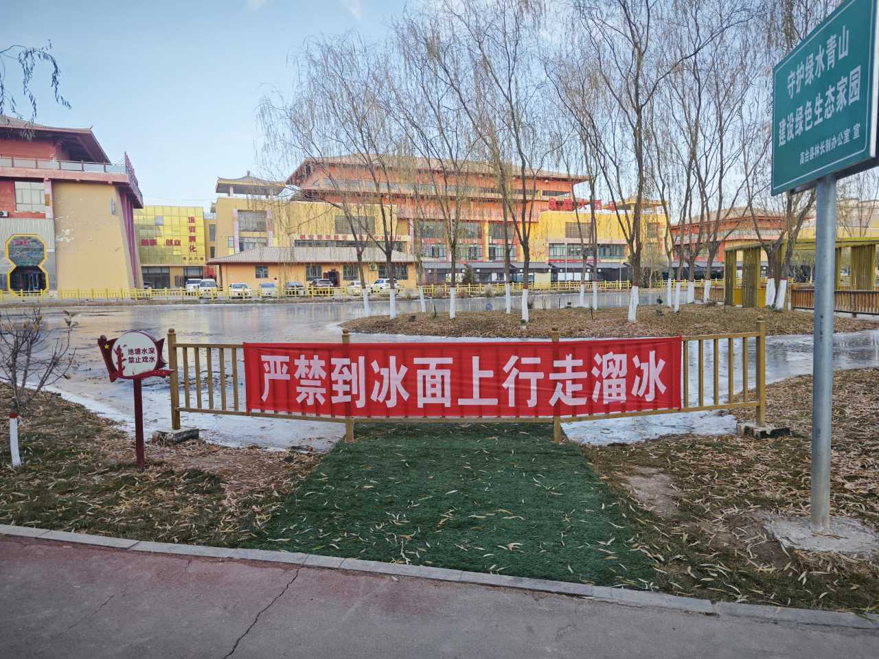 入冬以来,随着气温持续降低,公园湖面已进入结冰期,但是冰层薄厚不一、情况复杂,且冰面承载力低,为了严防冰面行走、嬉戏等危险行为,高台县城市园林绿化局多措并举积极做好冬季冰面安全管控工作。
