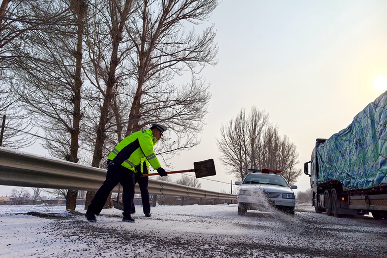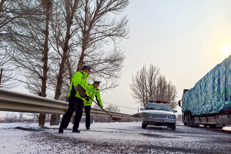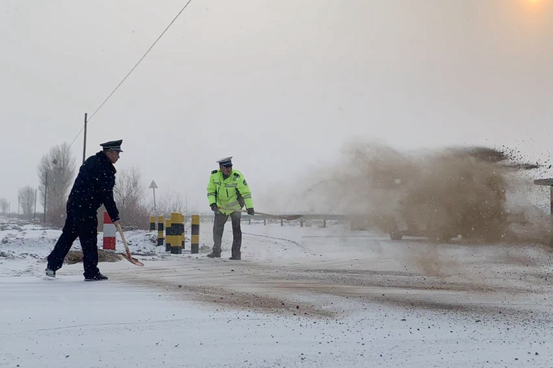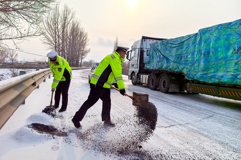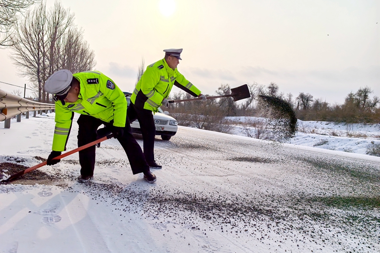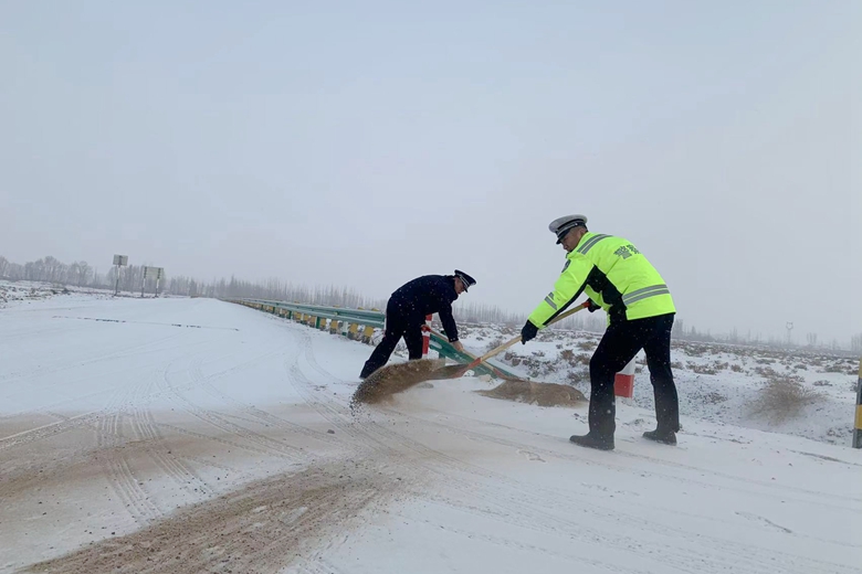 降雪天气出现后,根据雪情变化实时优化调整勤务,最大限度地将警力投放到路面,提高路面见警率,强化辖区重点路段巡查管控力度,对陡坡、弯道等事故易发处民警着重清理、铺撒防滑沙,同时提示过往车辆驾驶人根据雪天路况,保持安全车距,严格控制车速,做好“降速、控距、亮尾”等安全措施,尤其是行经农村公路以及路窄、弯多、弯急、长下坡路段时,更要谨慎驾驶,注意行车安全。