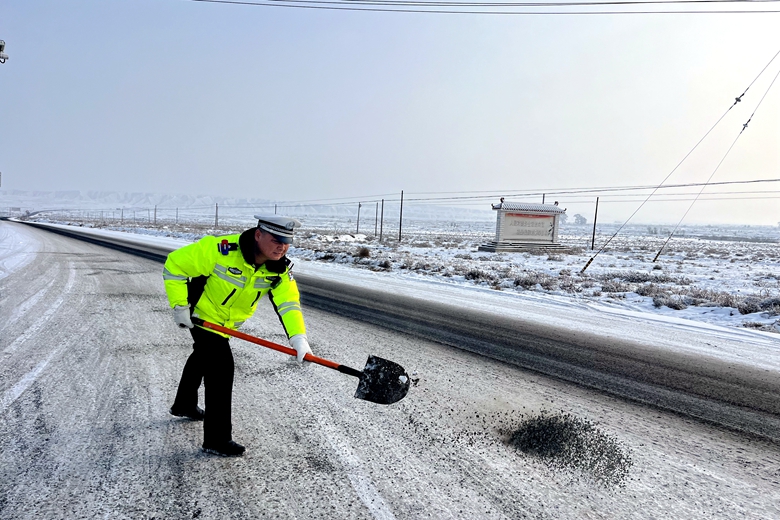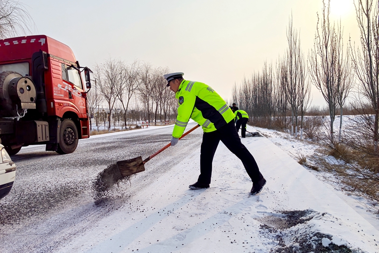 12月10日,受冷空气影响,高台县出现降雪天气,造成境内部分道路不同程度积雪结冰,安全隐患增大。高台县公安局交通警察大队为积极应对此次降雪寒潮天气,以雪为令、全警动员,第一时间启动恶劣天气应急预案,大队领导分片包干部署警力,积极开展车辆疏导、融雪清障、服务群众、宣传警示等各项工作,全体民辅警坚守在执勤一线分兵把守、沿线巡控,采取远端控制近端分流,坚决做好冰雪天气道路疏堵保畅工作。