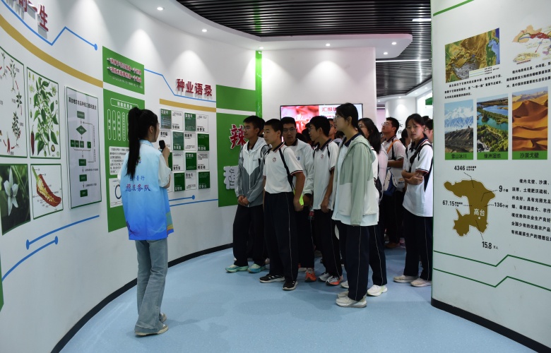 步入绿色辣椒生产技术科普示范基地的信息化展厅,一组组图文并茂的展板和生动图片,将辣椒产业的前世今生、发展脉络与品种奥秘娓娓道来。同学们穿梭在“辣之源”“辣之耘”“辣之种”“辣之味”等九大主题展区,饶有兴趣地追寻辣椒从田间手工劳作到高科技赋能的神奇转变,真切感受到了科技为传统农业注入的澎湃动力。许多同学一边观看,一边记录,还不忘互相分享新发现的“科技秘密”。