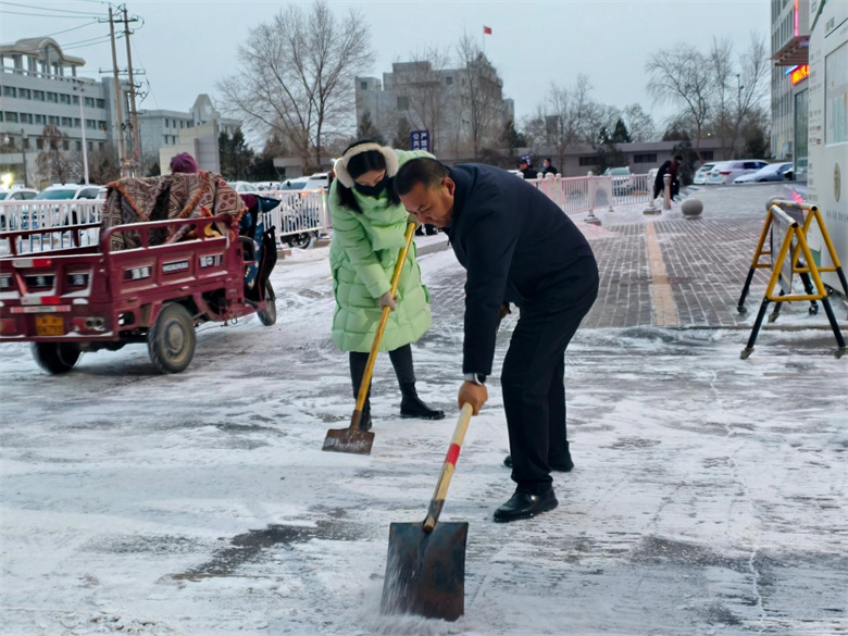 “大家动作快一点,先把急诊通道清出来,这里是生命通道,绝不能堵!”院领导率先垂范、干部职工闻令而动,纷纷拿起铁锹、扫帚、推雪板等工具,迅速奔赴各责任区域。尽管寒风凛冽,大家却热情高涨、分工有序:挥锹破冰、扫除积雪、推雪清运,忙碌的身影在白雪覆盖的院区里穿梭,勾勒出一幅暖意融融的画面。