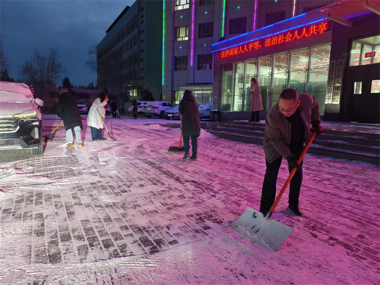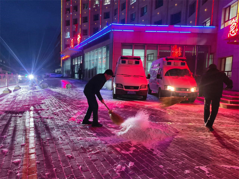 从黎明前的夜色到晨光渐亮,全院职工团结协作,将院区主次干道、急诊通道的积雪积冰彻底清除,为前来就诊的患者、陪护家属及全院职工营造了安全、畅通、便捷的出行环境。
