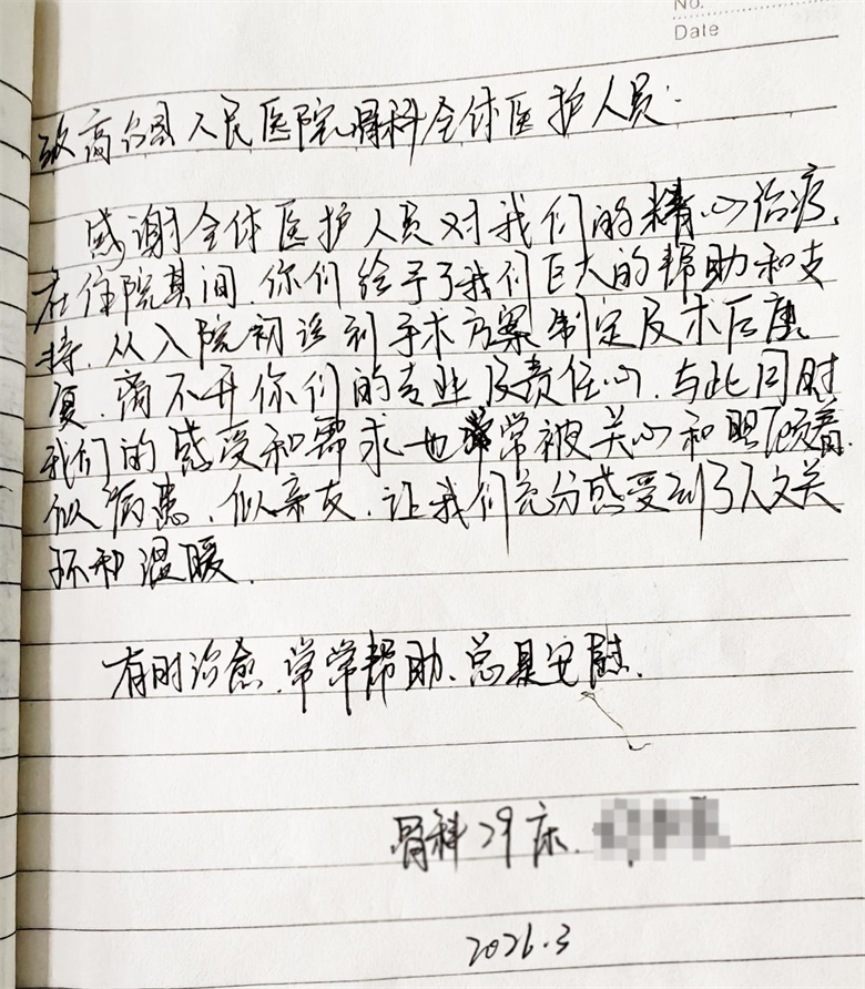 医者有温度,医患有温情。自全省医疗机构“十个多一点”暖心行动深入开展以来,高台县人民医院骨科始终坚守 “以患者为中心”的服务理念,将“多一点微笑、多一点沟通、多一点关心、多一点耐心”等要求融入诊疗服务全过程,以专业与温情守护患者健康。近日,科室接连收到同一患者的手写表扬信与致谢锦旗,这份双重认可,既是患者对暖心服务的高度肯定,更是科室践行“十个多一点”暖心行动的生动缩影。