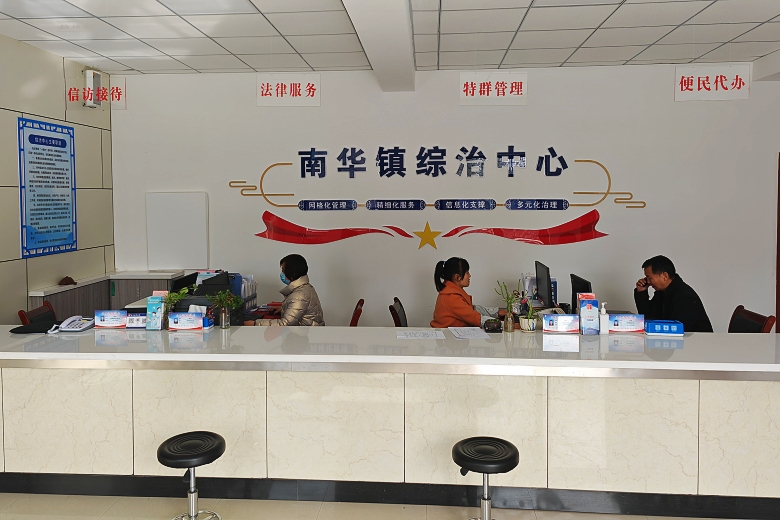 “一个中心”解民忧,破解“服务质量不优”难题。坚持建强用好阵地,整合司法调解、信访维稳、社会治理、平安建设等职能,建成占地面积300平方米的南华镇综治中心,并按照“三中心一网格”建设要求,设置服务大厅、多元化矛盾纠纷调解中心、心理咨询室、反邪教,禁毒教育警示室、个人工作室等功能科室。同时在各村(社区)建立综治中心16个,建立“一体化”管理、“一站式”服务和“中心吹哨、部门报到”运行机制,打造顺畅高效的集中办公、集约管理、集成服务运转模式,构建衔接紧密的全闭环、全周期、全过程管理体系,着力提升综治中心实体运行效能,切实让“干部多做事,群众少跑腿”成为常态。