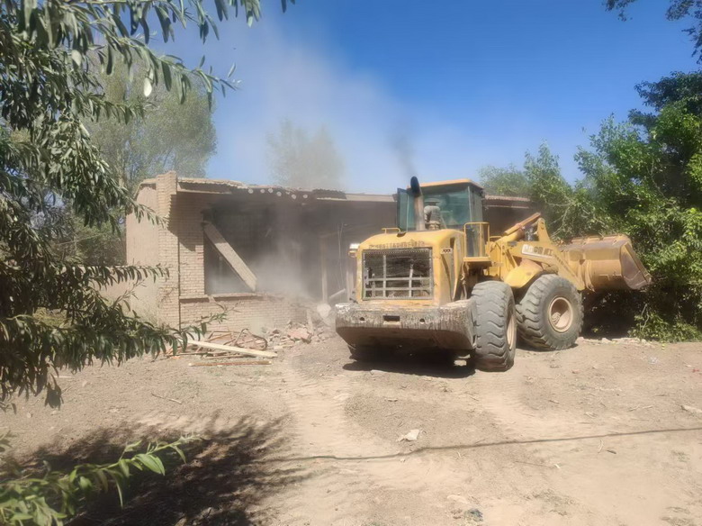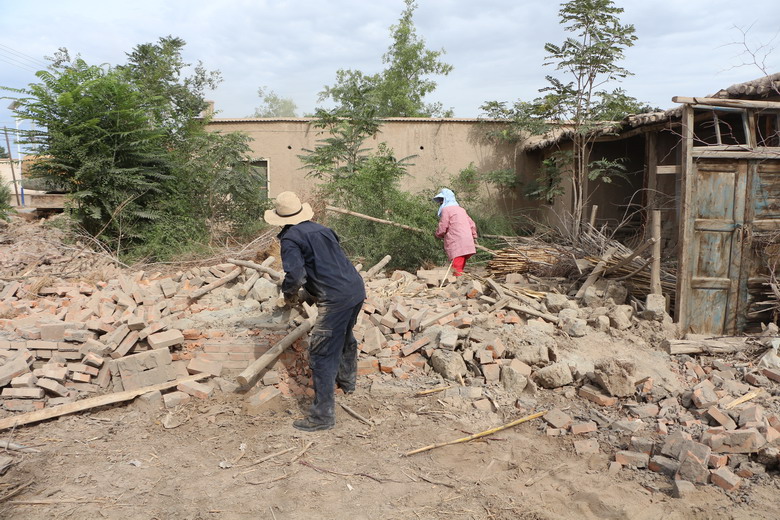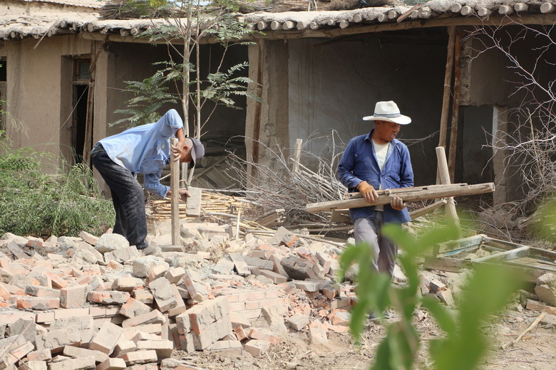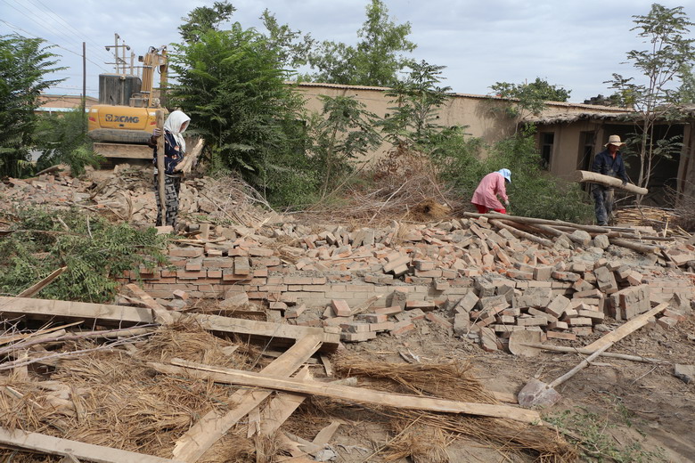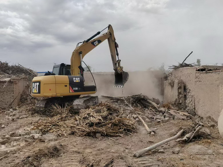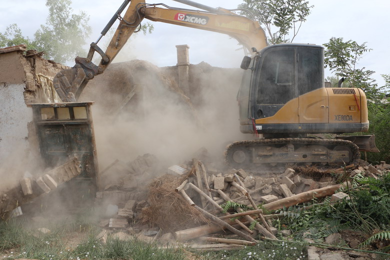 在乐二村,随着装载机隆隆的轰鸣声,村民冯勤德上世纪八十年代的修建的一院土坯房应声而倒,施工人员在机械的配合下,清木料,运砖瓦,回收可利用的建材物料。