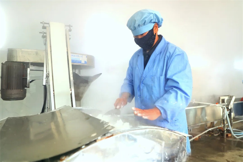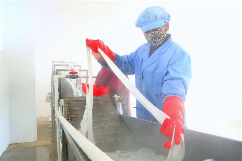 和面拧团、出条水煮、日光晾晒、自然风干……初冬农闲时节,正是粉条加工晾晒的最佳季节,在骆驼城镇建康村味之源食品生产加工车间里,工人们一大早就热闹起来,满屋热气腾腾,雾气弥漫,一排排晾晒在院内的粉条,晶莹剔透,格外亮眼。
