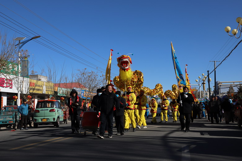 喧天的锣鼓敲起来,激情的社火闹起来。2月6日,由宣化镇各村组成的社火队走街串巷,以四龙八狮的阵容为群众舞龙耍狮,逐街送福,增添了乡村浓浓的“年味”。