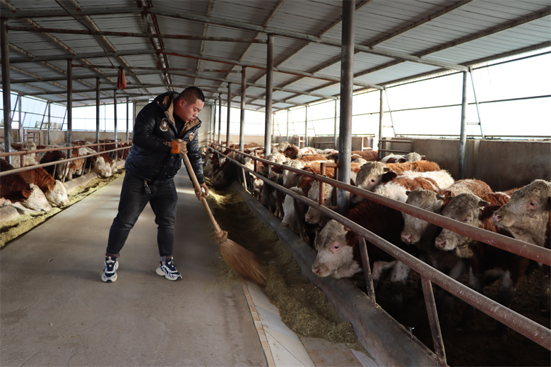 一大早,田兴凯就忙着清扫圈舍、投喂饲料,这几年他通过不断引进优良品种、优化饲料配方等方式,将肉牛育肥产业做的有声有色。“目前牛的存栏量为90余头,基本上都是育肥牛,这些牛在9月-10月份就能出栏了,价格随行就市。”田兴凯说道。