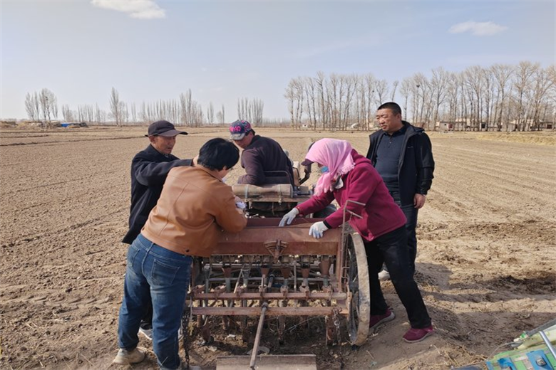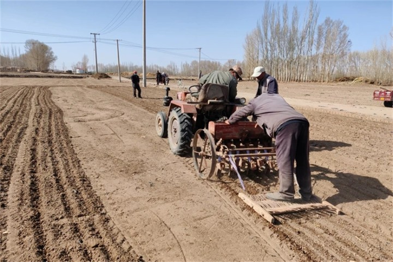 在合黎镇六三村,机声隆隆,小麦播种机正开足马力来回穿梭,一粒粒饱满的小麦种子被播种到地里,田间地头一片热闹繁忙的景象。在春小麦播种现场,镇农业技术人员全程跟踪指导,严格把控播种深度、行距等关键环节,确保小麦播种质量。