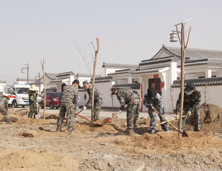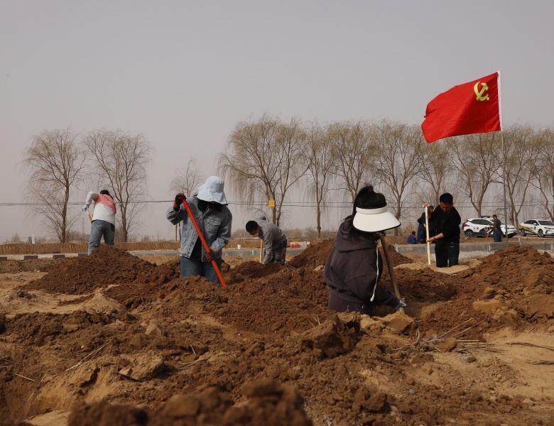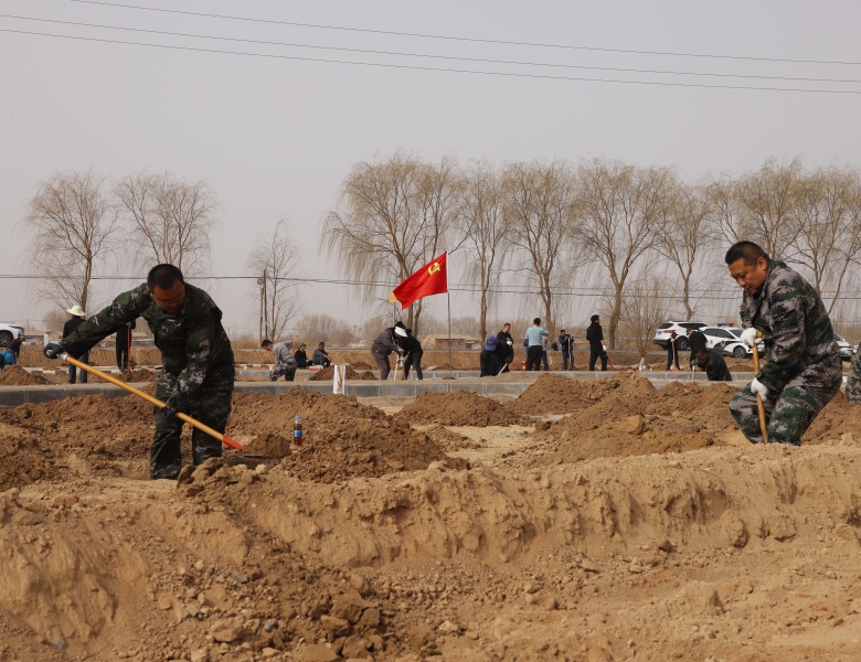 植树现场,鲜红的党旗迎风飘扬,150多名机关干部职工干劲十足,以党小组或业务口划分的造林绿化小组,分区包片,分片划段,比进度、比质量、比效率,党旗插在哪里,哪里就是攻坚阵地。大家三人一行,两人一组,互帮互促,严格按照栽植要求,挖深坑、换新土、栽壮苗。刚刚迁入新居的村民也自发加入到绿化队伍,和干部职工一起开坑打穴,为他们端茶送水,做好后勤保障。