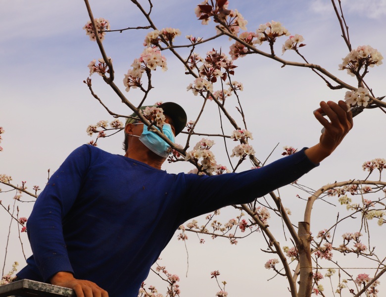 时值四月芳菲季,又逢梨花烂漫时,走进宣化镇站南村村民赵林的百亩梨园,雪白的梨花连成一片,10多名“花匠”穿梭林间吊枝梳花,成群的蜜蜂在花丛中飞来飞去。