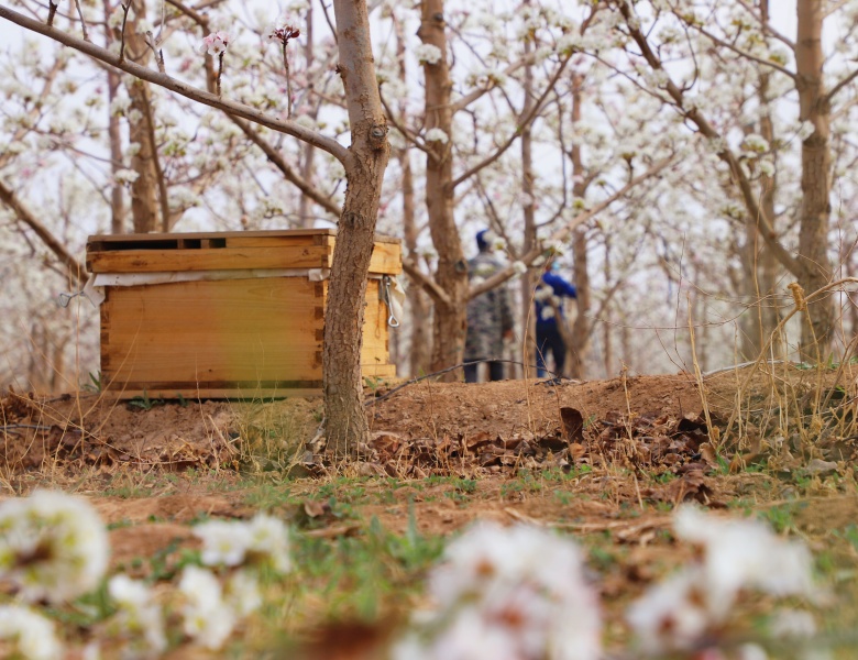 往年这时候,15个工人得扛着梯子、拿着鸡毛掸子,在梨树丛里爬上爬下忙活半个月。今年租了25箱蜜蜂当“授粉工”,半个月的花期,既传了花粉又采了蜜。原先人工授粉不均或有遗漏,结的果子大小不一,现在蜜蜂绕着每朵花打转,结出的梨子圆溜匀称,品相好,价格也好。据赵林估算,今年光人工费就能省下两三万,加上果树进入盛果期,预计今年的收成比去年更好。