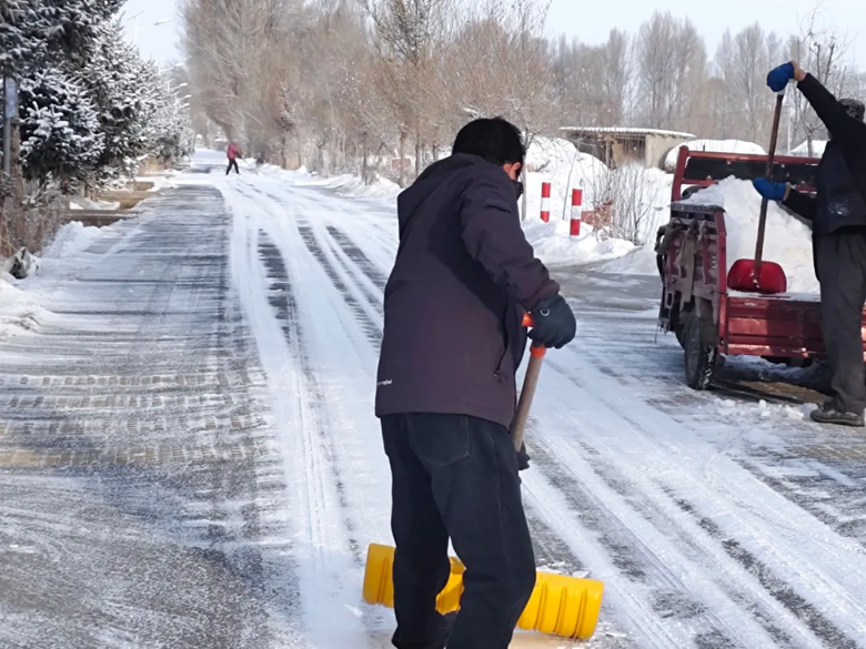针对镇村主干道、十字路口、坡道弯道、党群服务中心、学校周边等重点区域积雪厚、清理难度大的情况,各村统筹调配铲车、清运车等机械设备,采取“机械铲雪+人工清面”的作业模式,大幅提升清雪效率,机械轰鸣开路,集中清理主干道积雪,志愿者们紧随其后,手持铁锹、扫帚等工具,仔细清理人行道、房前屋后及机械作业盲区的残雪碎冰,做到清雪无死角、通行无阻碍。