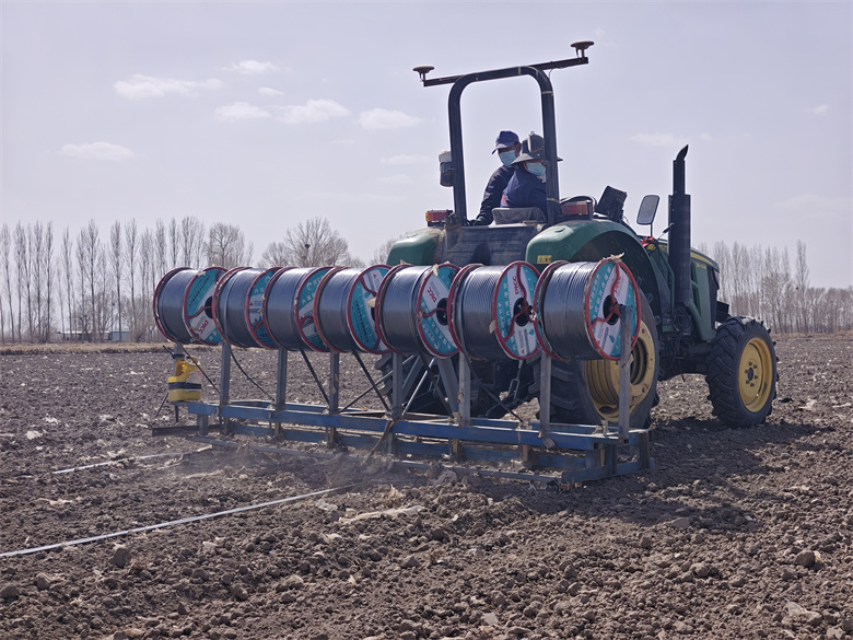 “往年漫灌费水费力,还浇不均。现在滴灌直接送水到根部,省水省肥还省心!”正在田间查看机械作业的村民马文斌笑着介绍,机械高效作业,让滴灌带紧密贴合地面,确保水肥精准输送、不流失不浪费。