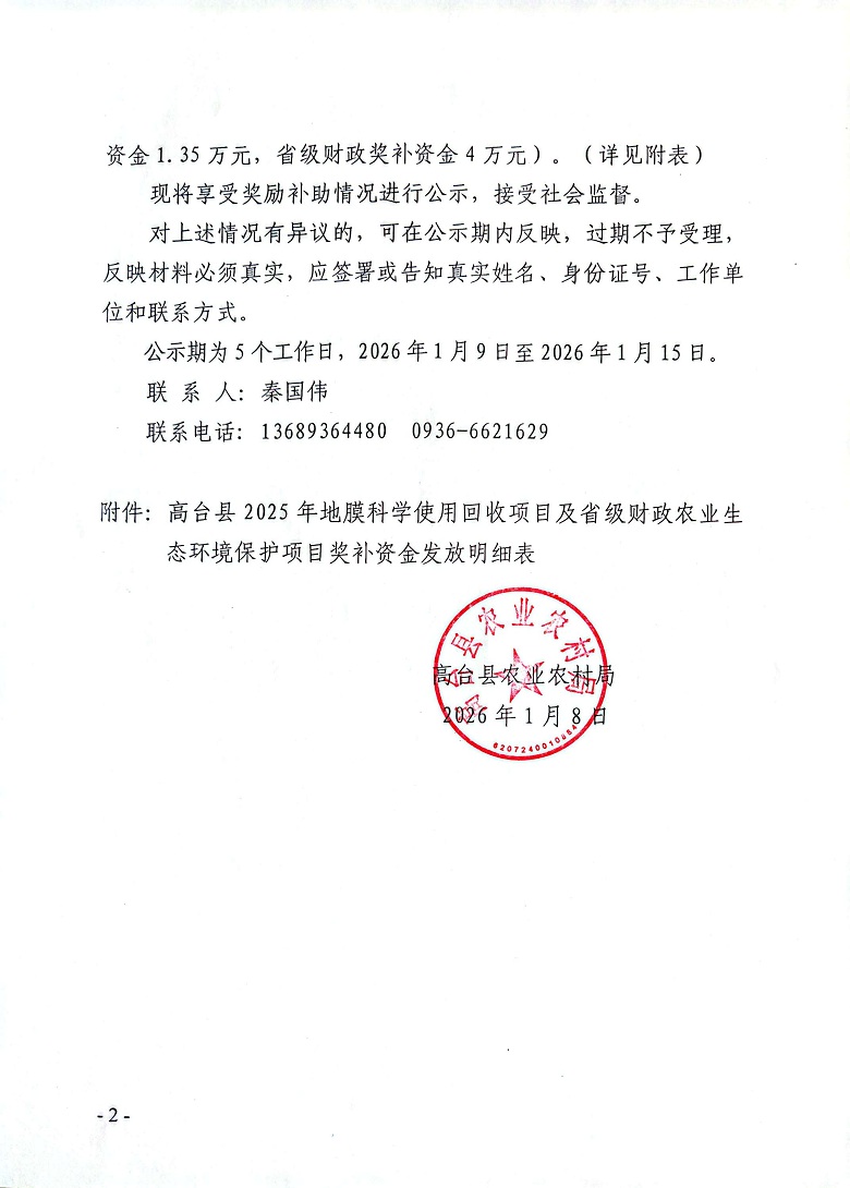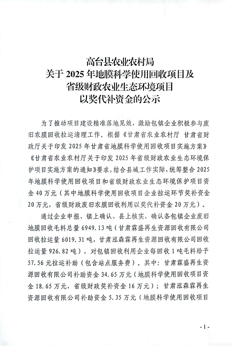 高台县农业农村局关于2025年地膜科学使用回收项目及省级财政农业生态环境项目以奖代补资金的公示