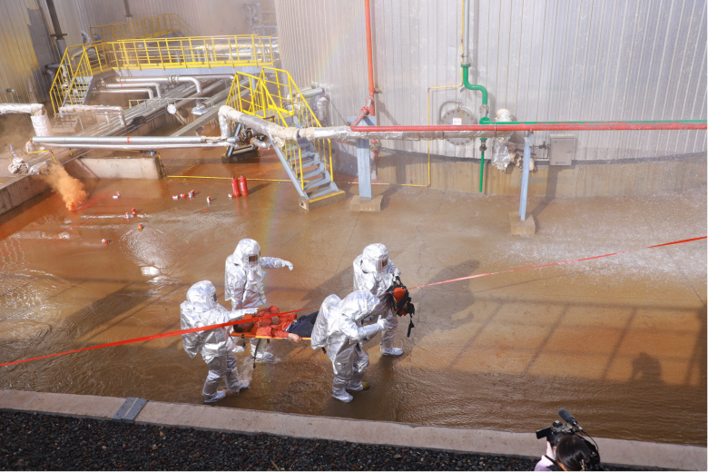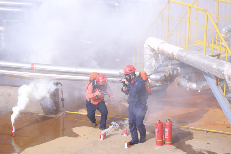 本次演练坚持实战导向,模拟兰能投公司A罐区210-T-110储罐出口管线法兰泄漏,在处置过程中突发闪爆起火,导致2名抢修人员昏迷,危及公司厂区内工人、生产装置、周边企业安全的危急场景。