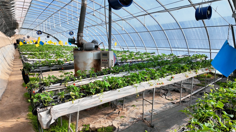 在康翠蔬菜专业合作社,现代农业的气息扑面而来。一排排整齐的架子上,草莓果实累累。这里不仅是采摘乐园,更是智慧农业的试验田。合作社全面推广高架无土栽培技术,利用基质固定作物根系,通过自动化水肥一体化系统实现按需供给,并巧妙利用昆虫趋性,悬挂黄蓝板进行物理诱杀,构建起绿色防控屏障。这种精细化的智能管理模式,极大优化了作物生长环境,确保了果蔬的高品质与鲜美口感,为设施农业发展注入“科技含量”。