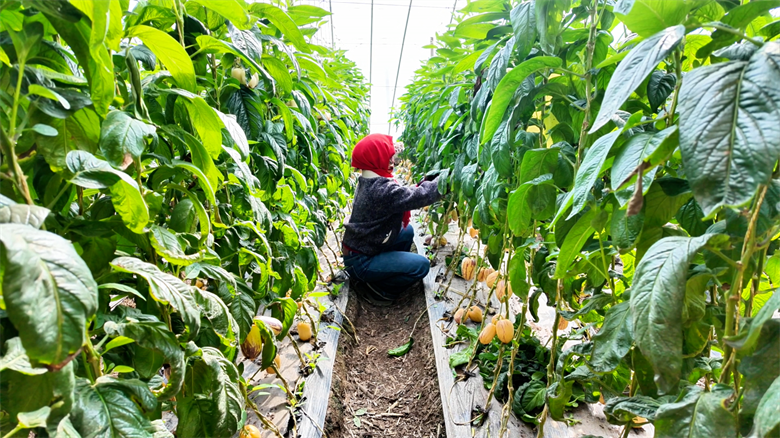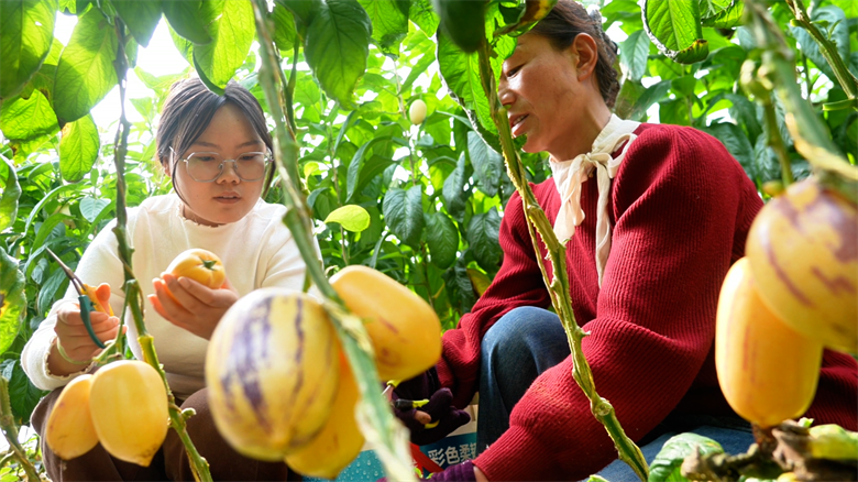 在宣化镇台子寺村人参果种植基地的温室大棚内,沁人心脾的果香扑面而来,种植户方彩琴正麻利地采摘着饱满熟透的人参果。从四年前摸索种植到现在成为村里的种植能手,方彩琴尝到了种植人参果的甜头。头两年缺技术、少经验,后来她巧打时间差、利用家门口的地理优势,2025年三棚人参果卖了近17万元。