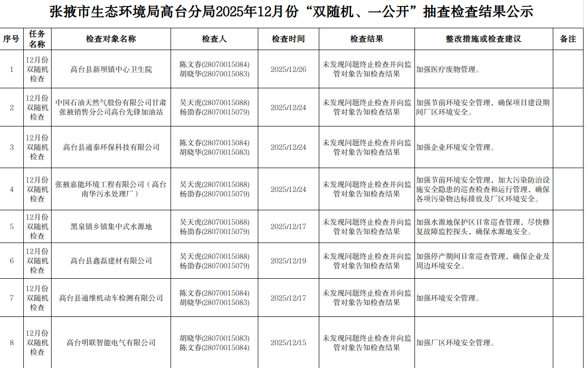 现将张掖市生态环境局高台分局2025年12月份“双随机、一公开”现场检查情况公示如下: