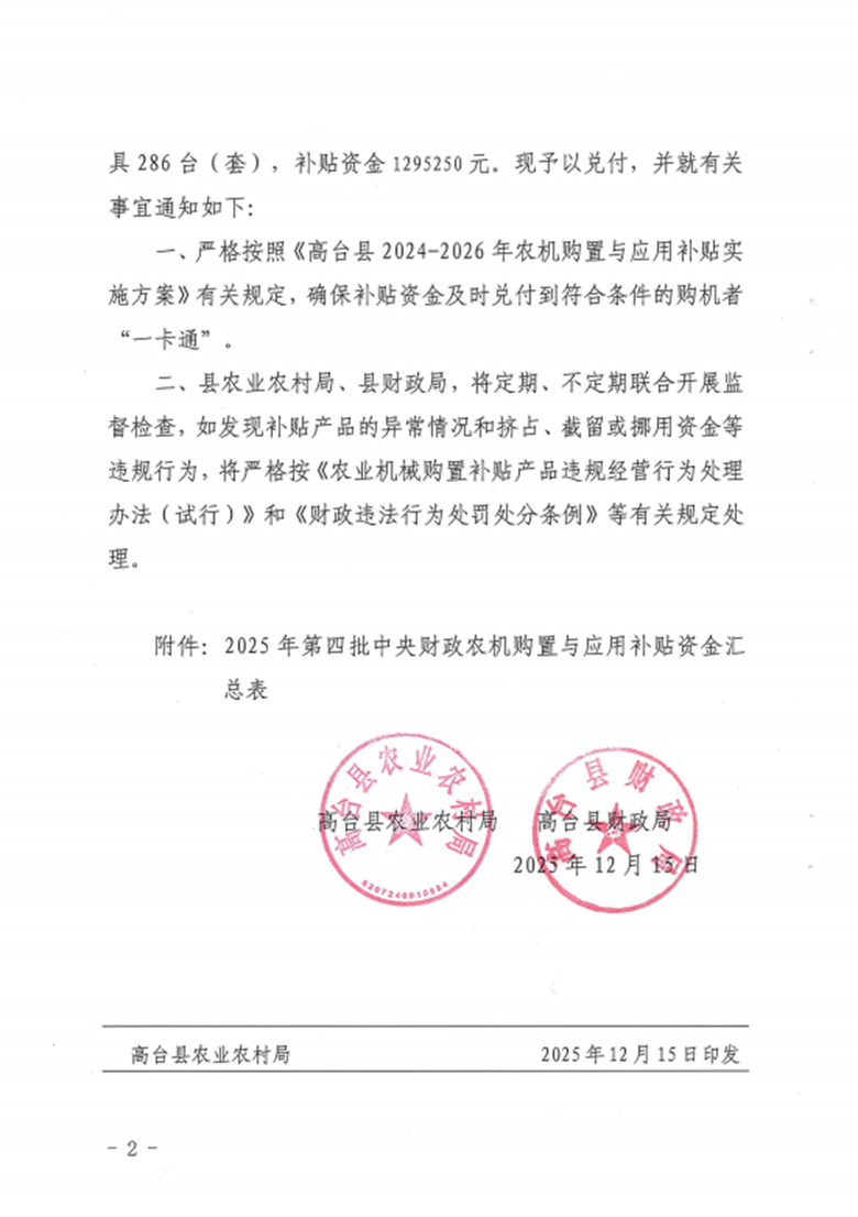 高台县农业农村局 高台县财政局关于兑付2025年第四批中央财政农机购置与应用补贴资金的通知