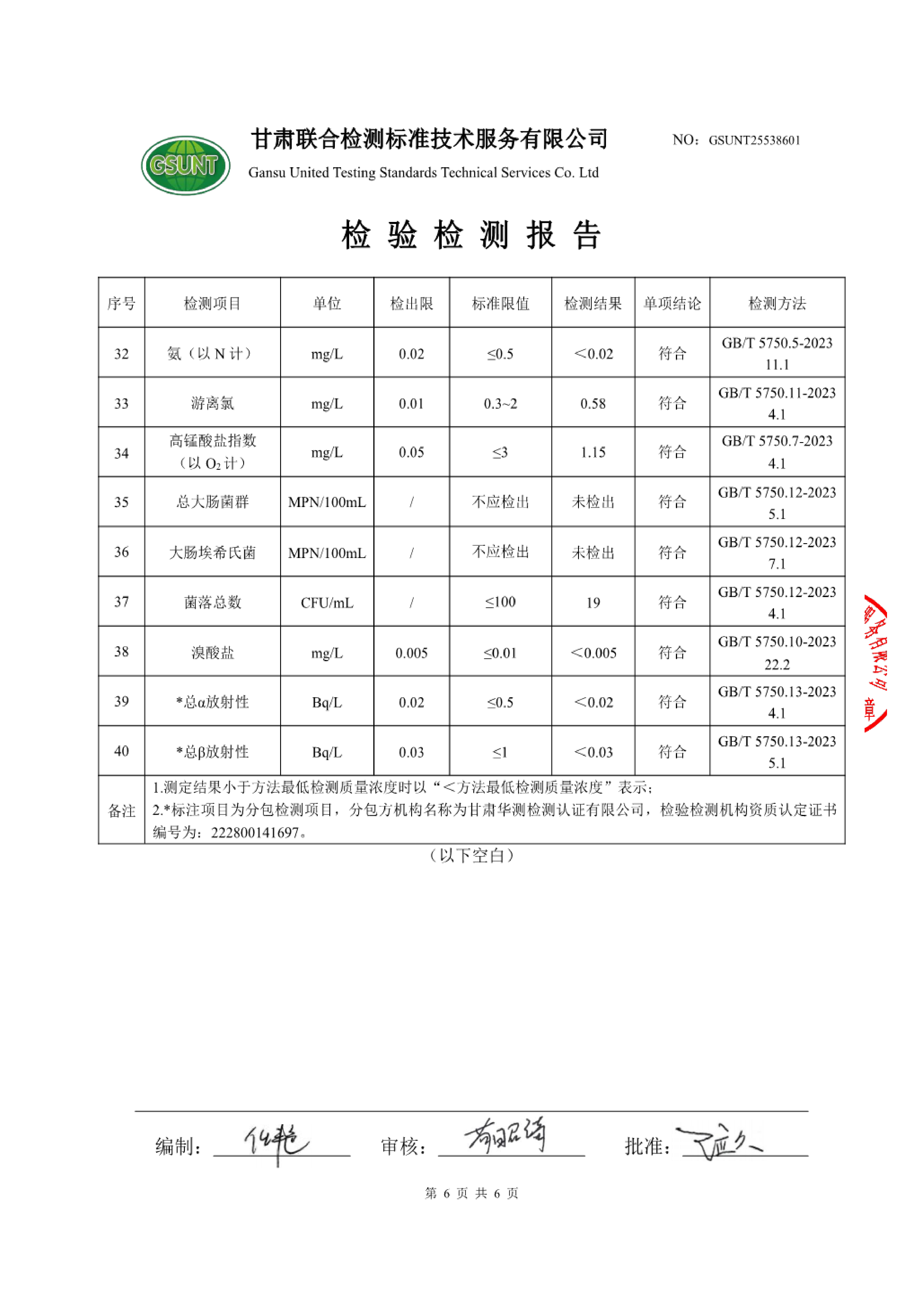 高台县城区饮用水2025年12月份水质(出厂水)检测报告