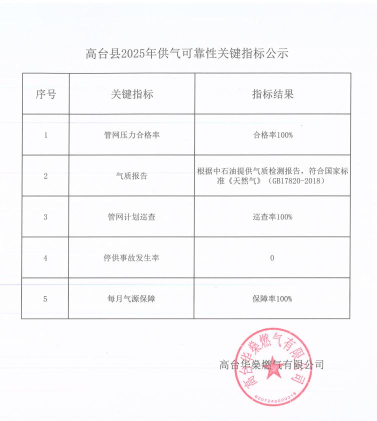 高台县2025年供气可靠性关键指标公示