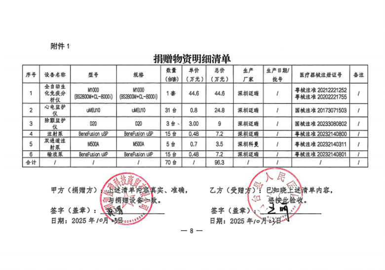 附件 :《捐赠医疗设备明细清单》(含物资名称、规格型号、数量、单价、总价、生产厂家等信息)