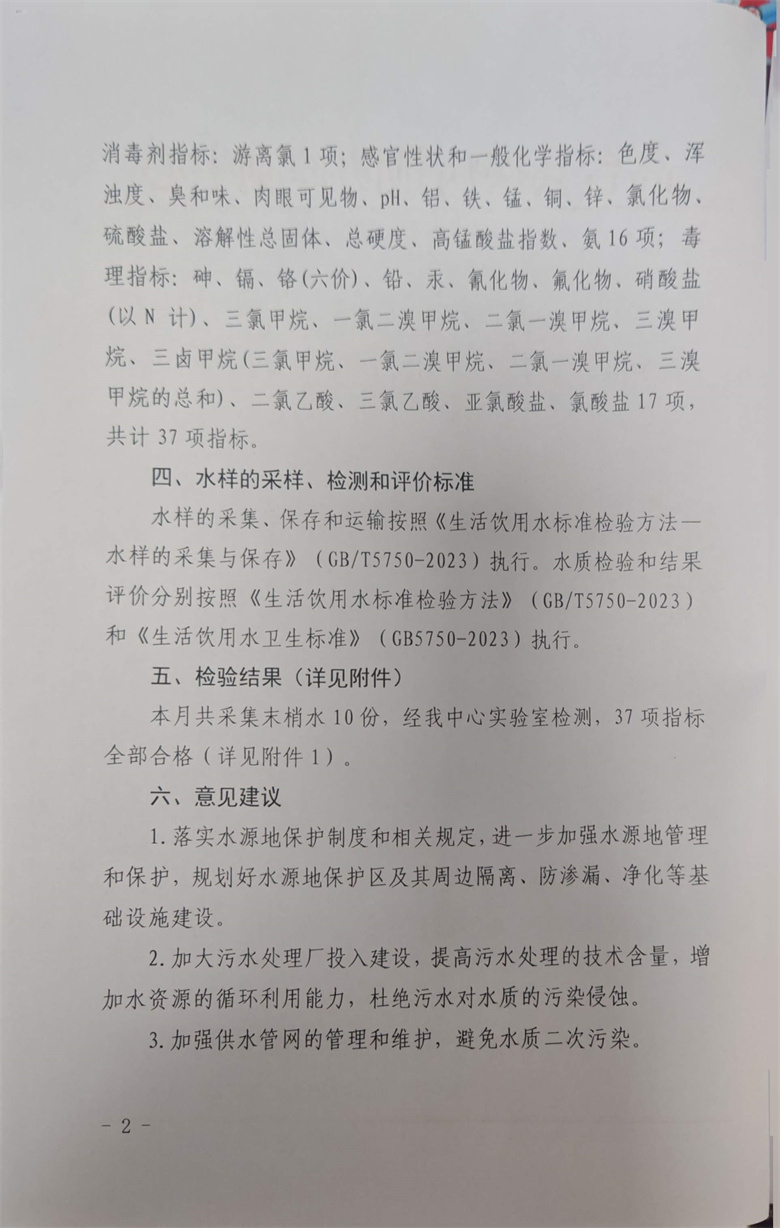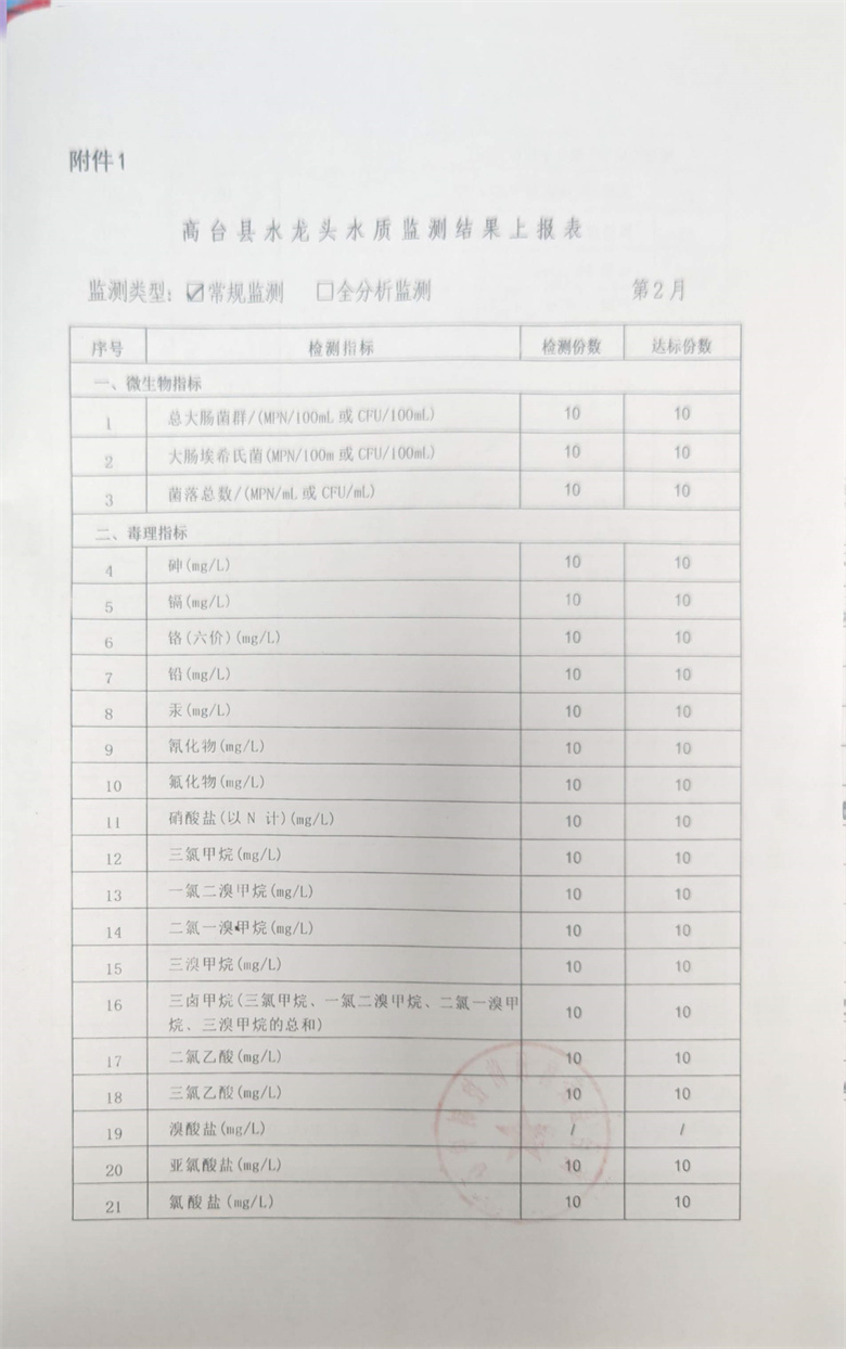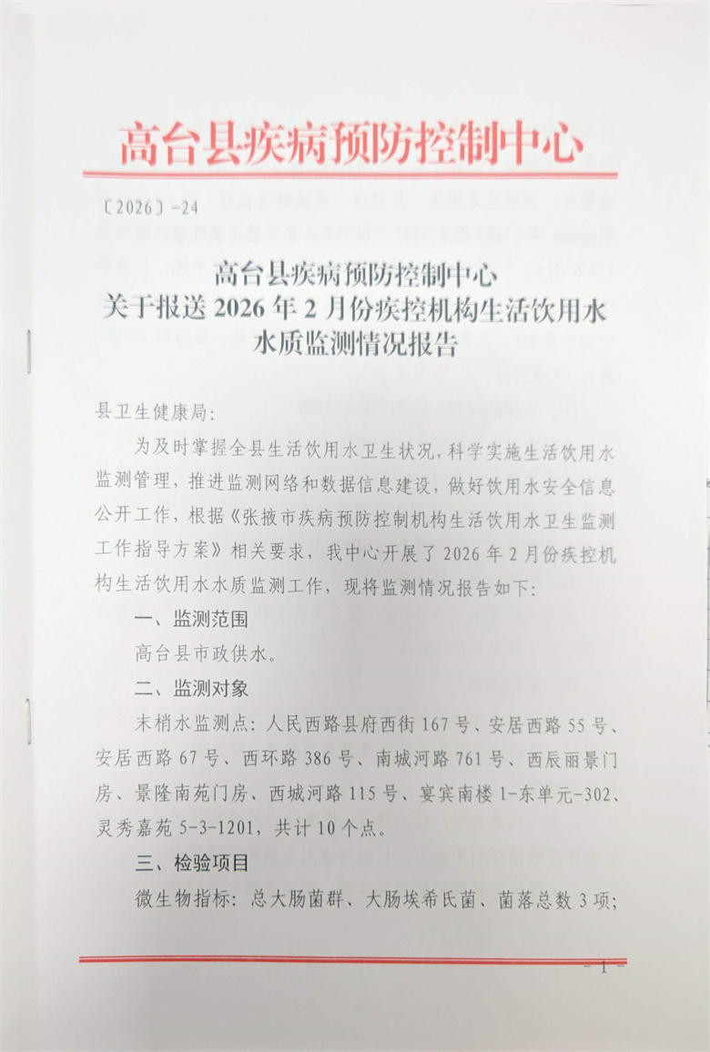 高台县2026年2月份疾控机构生活饮用水水质监测情况报告