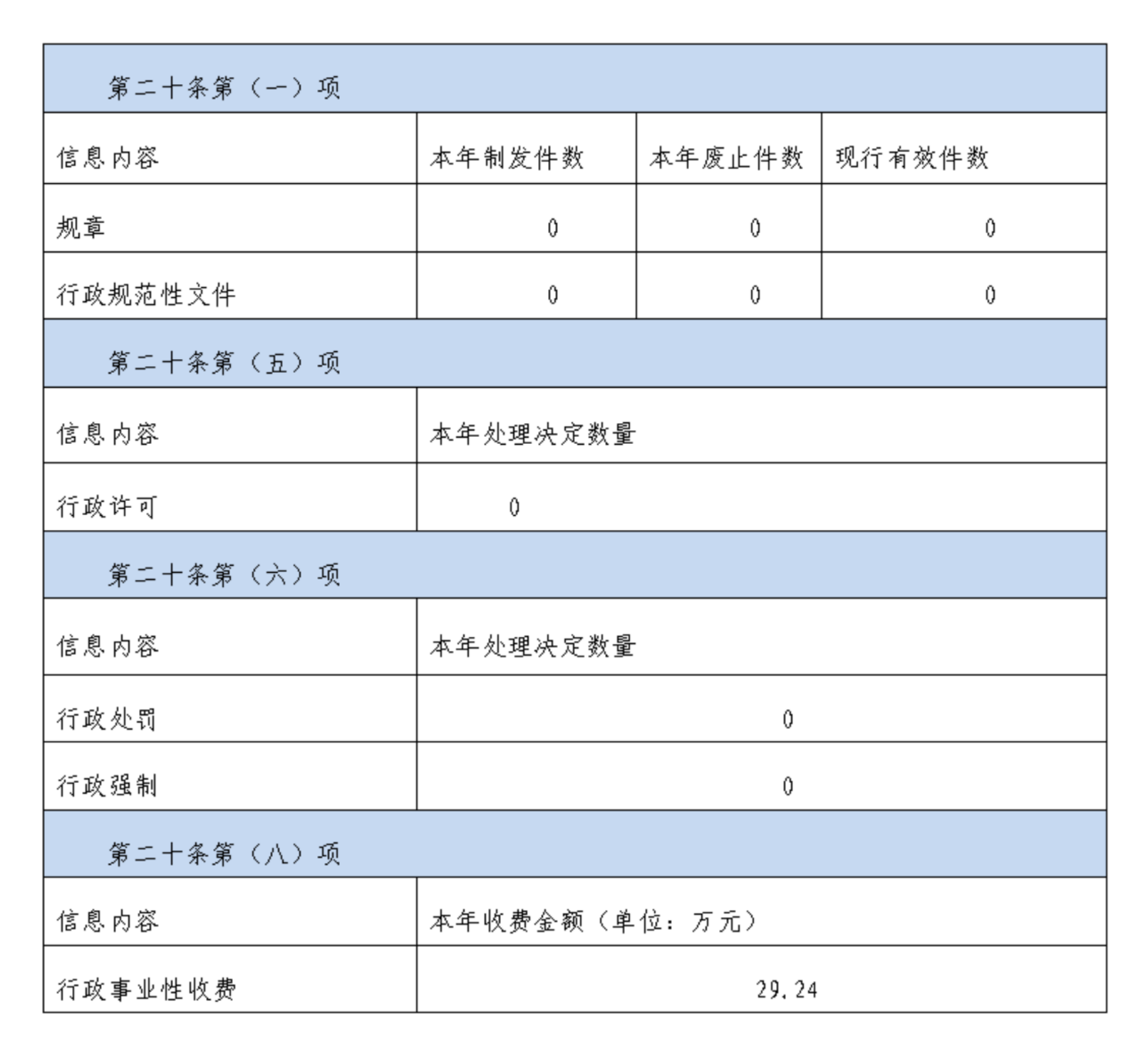 按照《国务院办公厅关于印发<政府信息公开信息处理费管理办法>的通知》(国办函〔2020〕109号)规定的按件、按量收费标准,本年度没有产生信息公开处理费。