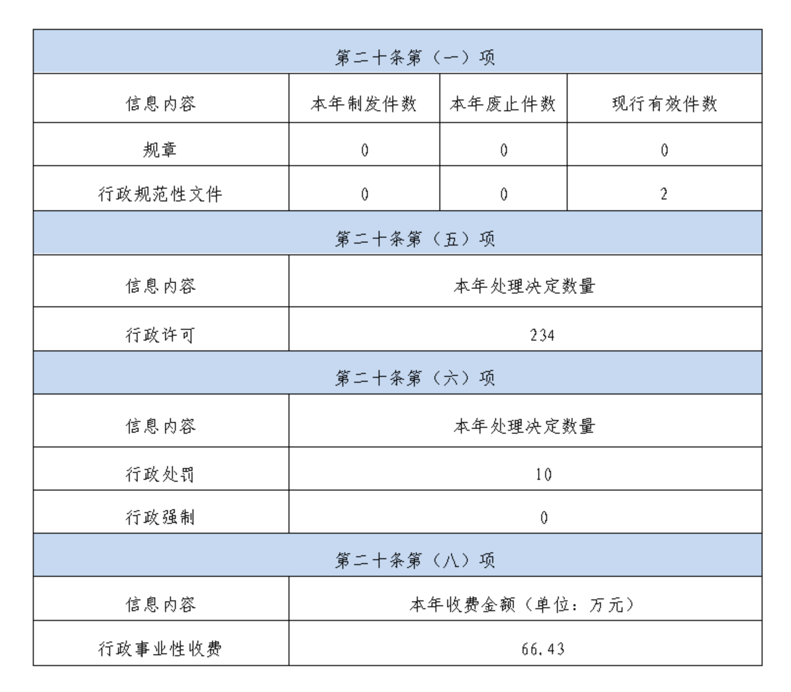 按照《国务院办公厅关于印发<政府信息公开信息处理费管理办法>的通知》(国办函〔2020〕109号)规定的按件、按量收费标准,本年度没有产生信息公开处理费。