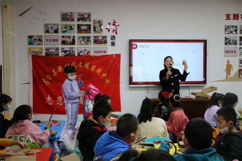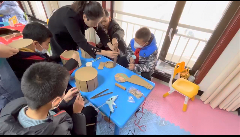 活动中,孩子们利用废旧纸板制作出了腰鼓、大鼓和拨浪鼓,将自己的新年祈愿书写绘画在鼓面上,绚丽的色彩描绘出崭新的画面,欢快的鼓声传递着浓浓的年味儿。孩子们以新颖、生动的形式敲出新时代少年对祖国和家乡的美好祝福!