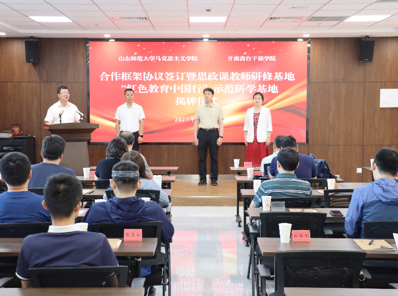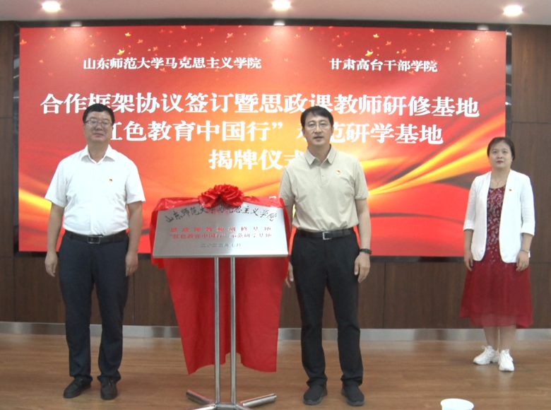 7月16日,山东师范大学马克思主义学院与甘肃高台干部学院合作框架协议签订暨思政课教师研修基地、“红色教育中国行”师范研学基地揭牌仪式在学院举行,山东师范大学马克思主义学院教师代表及甘肃高台干部学院教职员工代表参加揭牌仪式。