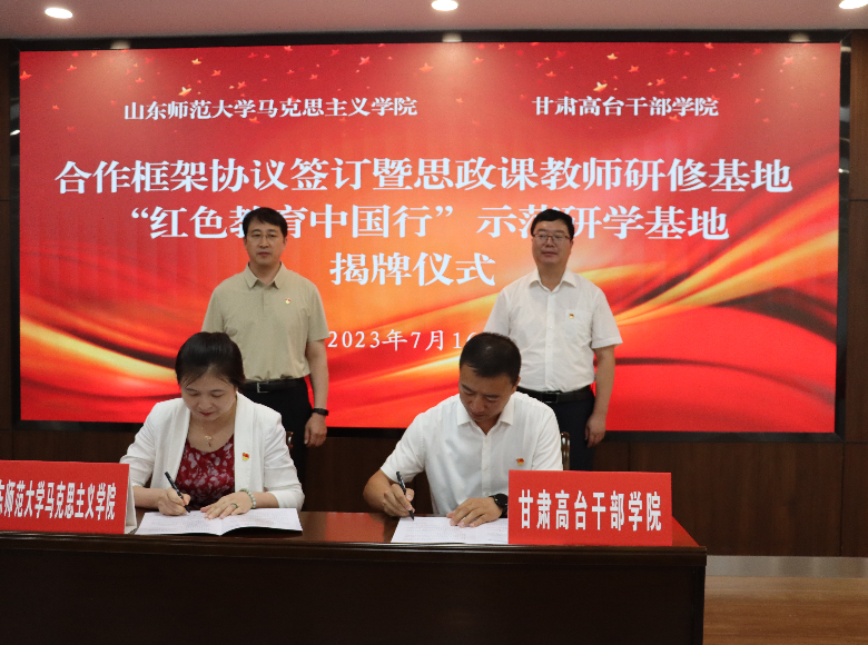 山东师范大学马克思主义学院党委书记吕晓勇、党委副书记潘磊出席揭牌仪式,山东师范大学马克思主义学院与甘肃高台干部学院双方代表签订合作办学框架协议并揭牌。