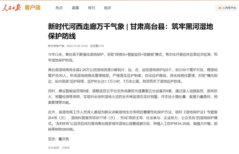 二、湿地资源监管务实高效。制定印发了《高台县湿地保护管理责任清单》,健全完善生态环境和资源保护协作机制,促进湿地行政执法与公益诉讼检察有机结合。推行“提前函告提示、前置查询审核、巡查发现交办、整改评估验收”事前、事中、事后的闭环监管服务模式,全年审查审批占用湿地项目120起。落实湿地分级管理及名录制度,首次认定公布一般湿地名录7272.61公顷。