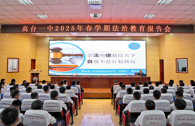 为深入推进青少年法治教育,助力平安校园建设,近日,高台县人民检察院党组书记、检察长郭永旺受邀走进高台一中,以“法治副校长”身份为该校高一年级约1000名师生带来一堂生动深刻的法治教育课。本次活动以“崇法明德鼎信天下 自强不息行稳致远”为主题,聚焦法律与道德、责任与安全,为青少年扣好“法治纽扣”,筑牢成长防线。