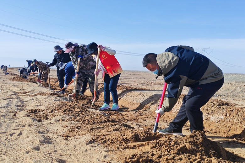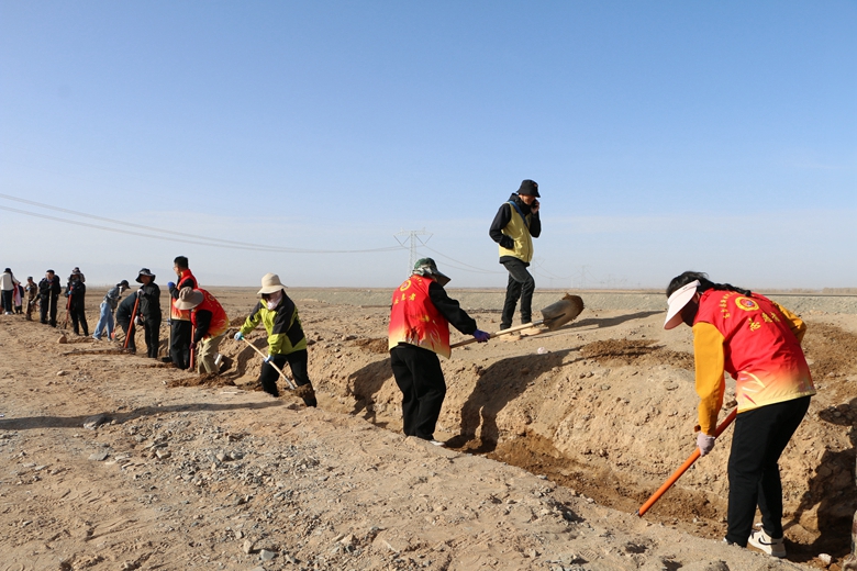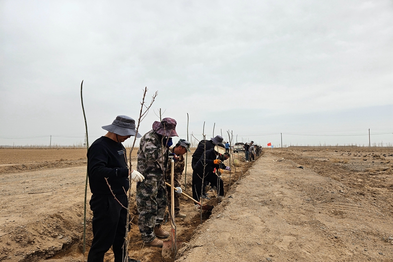 当日上午,参与植树的干部职工们集中来到义务植树现场,热情高涨、干劲十足。大家分工明确,配合默契,有的挥锹铲土,有的扶苗填坑,每一个环节都认真细致、一丝不苟,现场呈现出一片热火朝天的劳动景象,回荡着欢声笑语,充满了团结协作的氛围。在大家齐心协力的努力下,新栽种的树苗在春风中昂然挺立,为原本略显单调的土地增添了盎然生机。此次共栽植杨树、沙枣树共计1200余棵。
