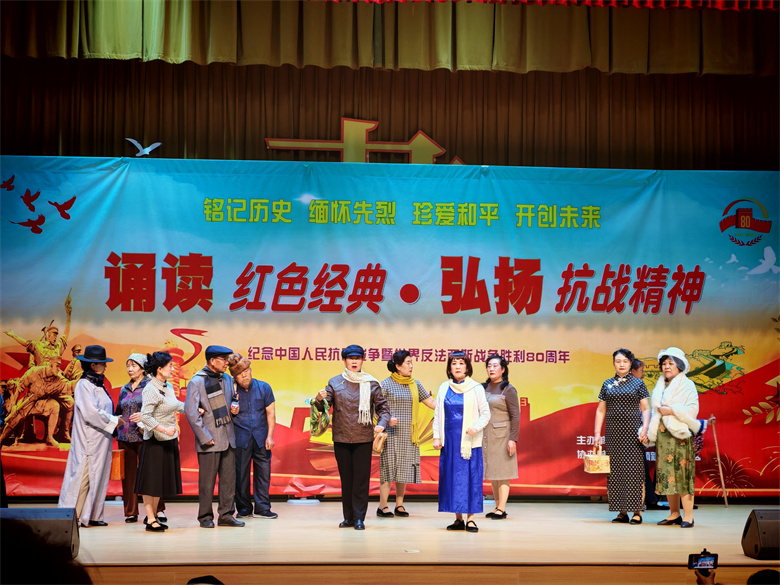 整场展演内容充实、形式多样,通过诗歌朗诵、情景剧、合唱等艺术形式,生动再现了那段不屈不挠的抗争历程。活动在两位高龄老人深沉而铿锵的朗诵《九一八,永不褪色的警钟》中拉开序幕,瞬间将观众带回那个刻骨铭心的历史时刻。随后,情景剧《松花江上》细腻演绎了战火中百姓流离失所的悲痛,合唱《抗日战歌》则激昂唱出中华儿女的豪情壮志,一悲一壮,交织出民族的气节与风骨。诗朗诵《英雄》以铿锵语句勾勒出无数用血肉筑起长城的英雄形象;《与妻书》借“为天下人谋永福”的赤诚之言,道尽革命者的家国情怀与铁骨柔情。紧接着,《不朽》、情景剧《大刀进行曲》《英雄祭》等节目接连上演,或深情缅怀,或慷慨激昂,将对先烈的崇高敬意与对历史的深刻铭记融入每一句台词、每一个动作之中。