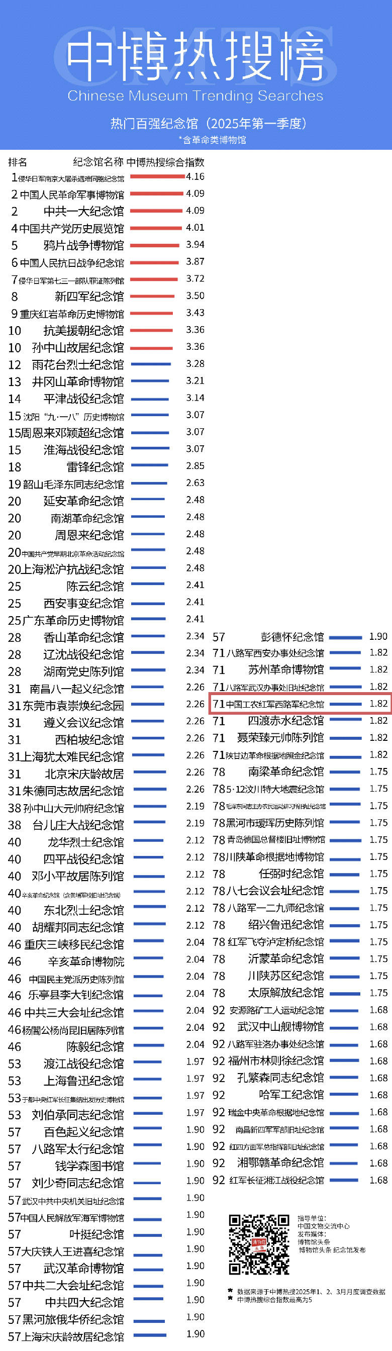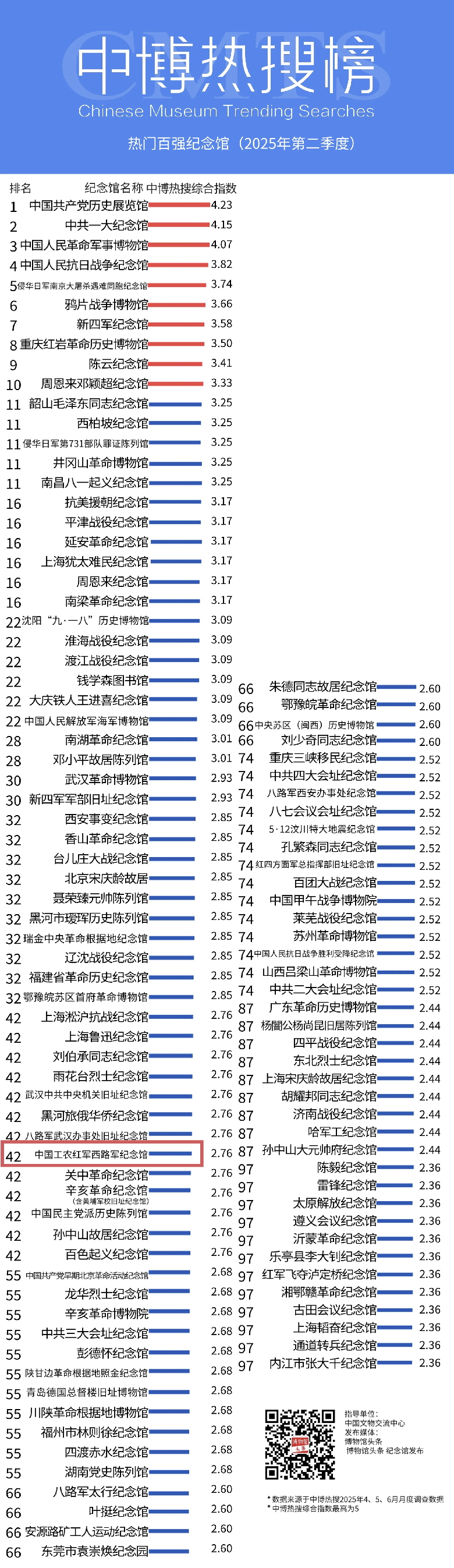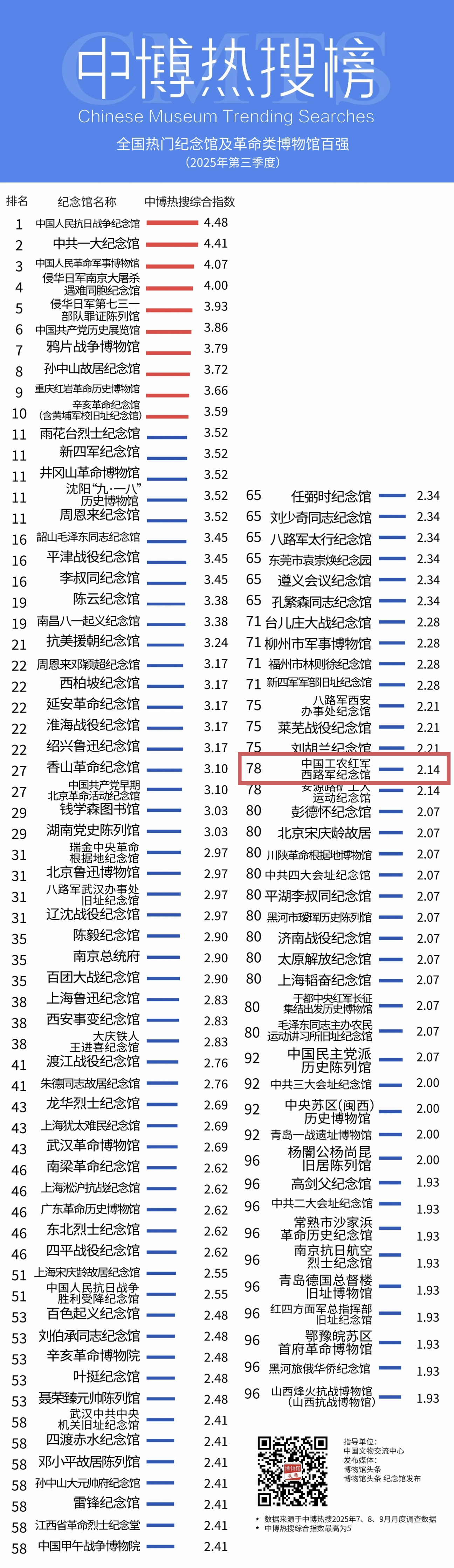 金秋送爽,捷报频传。近日,备受文博界关注的“中博热搜榜”2025年第三季度全国纪念馆百强榜单正式发布。中国工农红军西路军纪念馆凭借其深厚的红色底蕴、优质的社会教育服务与持续高涨的公众关注度,再度荣耀上榜。这标志着我馆在2025年前三个季度已实现连续稳居该榜单百强之列,彰显了中国工农红军西路军纪念馆品牌建设的显著成效。