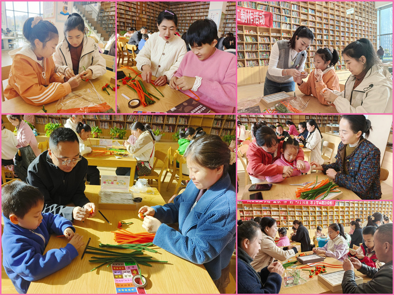最温馨的莫过于亲子手工制作环节。在图书馆老师的指导下,现场成为创意与温情的乐园。家长和孩子默契分工,有的家长用橘色扭扭棒做柿子,孩子用绿色做柿蒂;有的孩子尝试塑形,家长在旁辅助调整;还有家庭发挥创意,加绿色叶片、搭配出柿子树造型,或用彩色祝福语装饰画框,增添金秋氛围。制作中欢声笑语不断,孩子展示成果,家长夸赞创意,遇到困难时亲子交流技巧、互帮互助,彼此分享心得。普通扭扭棒在亲子合作下,变成形态鲜活的“柿子”,组装成独一无二的“柿柿如意”作品。孩子们捧着作品满是自豪,兴奋与家长合影留念,定格下这段温馨的亲子时光。