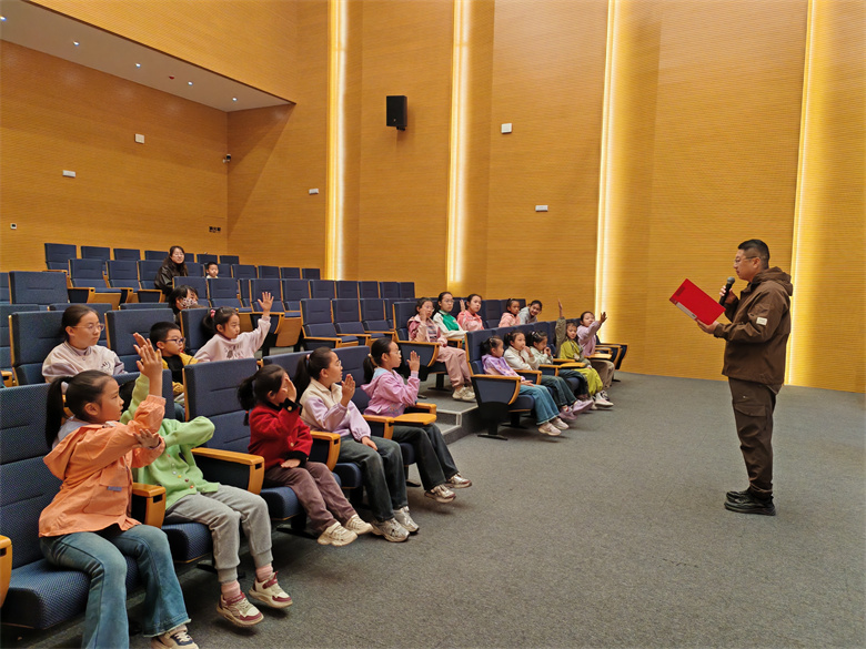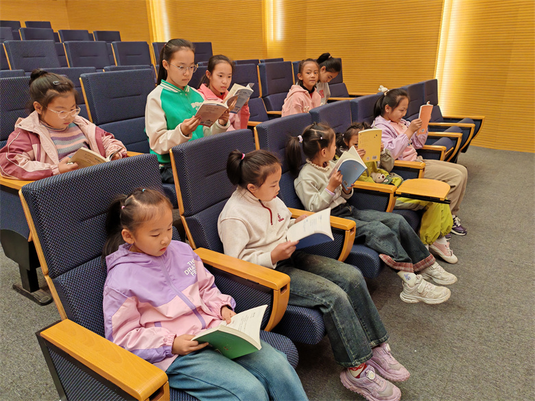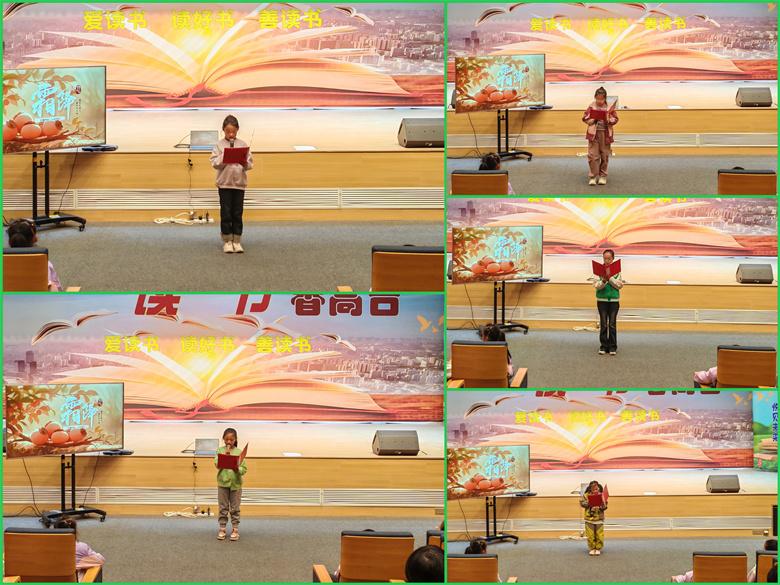 朗诵环节将氛围推向高潮。孩子们手持诗词卡片依次诵读。有的带着稚气的嗓音朗诵元稹的“风卷清云尽,空天万里霜”;有的神情专注,将苏轼“霜降水痕收”的秋景缓缓道来;朗朗书声与窗外的秋意相映,让整个大厅都浸润在诗词的韵律之美中。