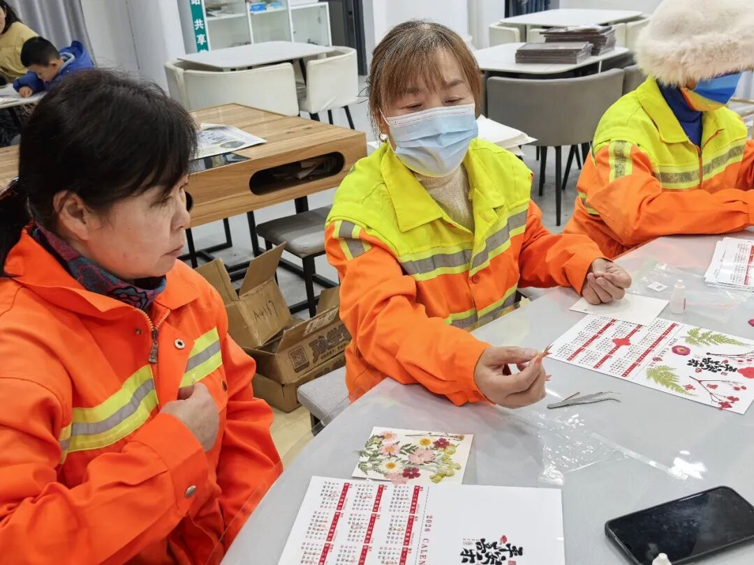 压花日历制作环节,志愿者细致讲解干花材料特性、工具使用方法及操作安全注意事项,引导大家按照“选花搭配→摆放构图→固定粘贴→装饰点缀”的流程展开创作。参与者们充分发挥创意巧思,将对新年的美好期盼融入一花一叶的排布之中。平日里忙碌在城市各个角落的双手,此刻变得格外细腻,一朵朵干花、一片片绿叶在日历纸上错落有致,化作一份份独一无二的2026年新年日历,定格住对新春的憧憬。
