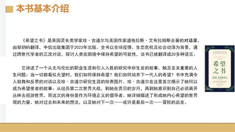 《希望之书》是英国生物学家珍・古道尔与美国作家道格・艾布拉姆斯合著的对话录。该书以“希望”为核心命题,提出“人类智识推动创新、自然具备修复韧性、青年行动带来变革、精神不屈创造未来”四个支柱。书中强调“希望”是主动选择而非被动等待,真正的“希望”需要行动和承诺,为读者提供了理解现实的多元视角。