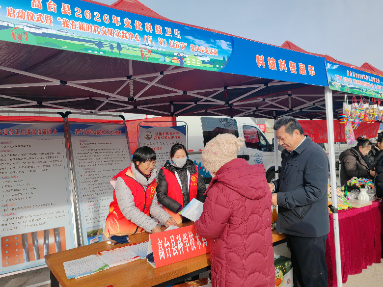 1月26日,高台县2026年文化科技卫生“三下乡”启动仪式暨“我在新时代文明实践中心过佳节”集中示范活动在骆驼城镇全面启动。县科技局组织科技志愿者开展科技科普宣传服务,把政策红利、法律知识和实用技术精准送到群众家门口。