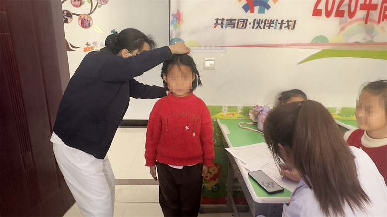 科普讲座结束后,健康监测工作随即展开。医护团队为每位小朋友逐一进行身高、体重、视力、血红蛋白四项核心指标检测:精准测量身高体重,对照儿童生长发育标准评估生长速率;通过专业视力筛查排查屈光异常等潜在问题;采集指尖血检测血红蛋白,判断是否存在贫血情况。监测过程中,志愿者温柔安抚小朋友的情绪,社区工作人员协助维持秩序、登记信息,医护人员耐心操作,整个流程高效又温馨。