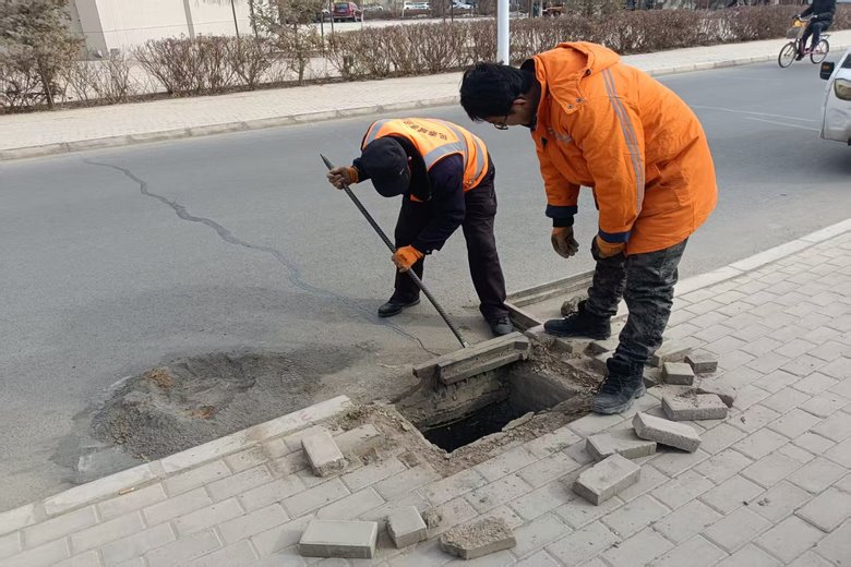 修复道路病害,提升通行安全。围绕城区道路、广场存在的路面塌陷、地砖破损、井盖松动等问题,公司开展专项修复整治,累计更换破损雨水箅子6个、修复塌陷污水井盖4套、平整修复路面塌陷4处,进一步增强了公共空间的安全性和舒适度。近日,西环路西景嘉园门口发生路面塌陷,公司立即启动应急预案,组织人员设备连夜抢修,于次日恢复通行,以快速响应切实减少了对市民出行的影响。