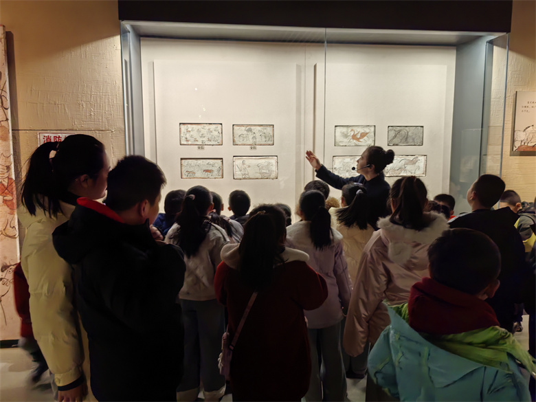 社教老师首先组织学生们集结博物馆大楼前广场,打卡全球生肖文化大联展展板。在“鸿蒙生灵骏——自然生态中的马”这一单元中,社教老师带领学生们探寻5600万年马类演化的奥秘;在“百艺载神驹——民俗艺术中的马”这一单元里,又领略了马在剪纸、年画等民俗中的吉祥寓意,沉浸式感受“人马相伴”的千年情缘。