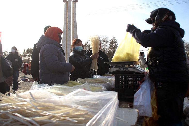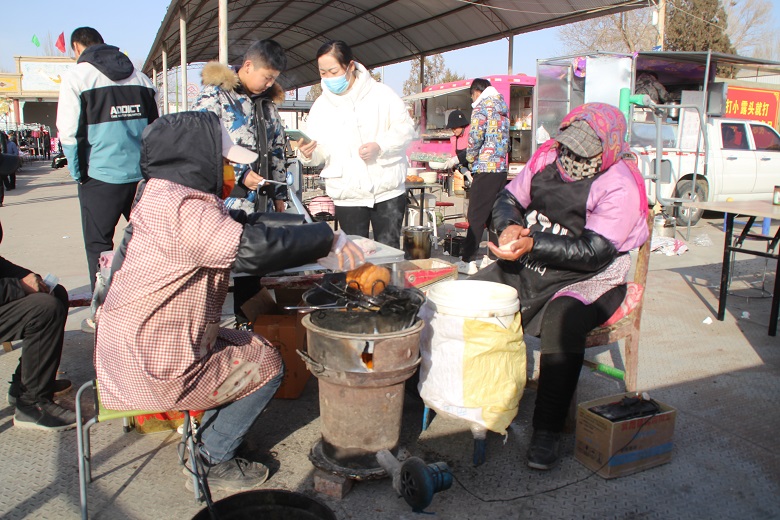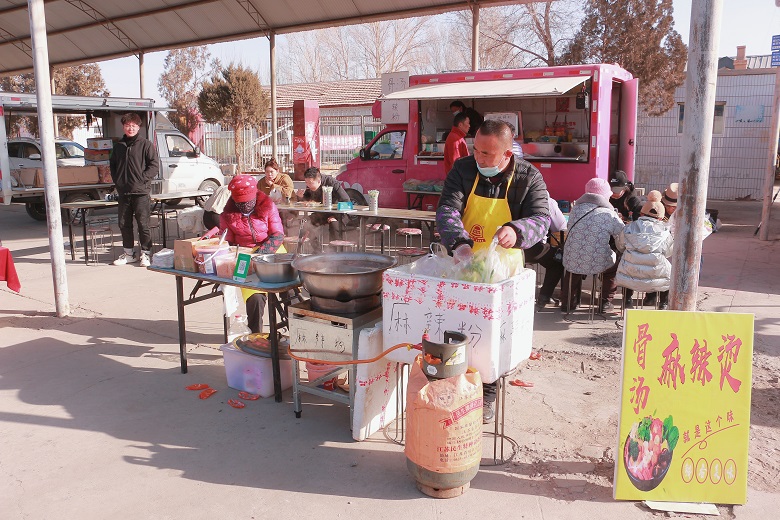 赶集现场,带着浓郁年味和地方特色的产品堆满了展台,不仅有粉条、面筋等土特产,也有油糕、麻辣烫等特色小吃,还有水果蔬菜、调料熟食、干果糖果等生活用品,来往的村民纷纷驻足在各展台前,询价、挑选、品尝,现场一片热闹的气氛。