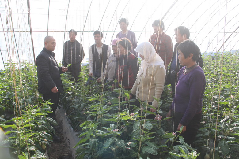 在台子寺村的温室大棚里,去年秋天移栽的人参果长势良好,第一层果品已成型上色,果农们正忙着梳花梳果、掐头打岔,进行田间管理。“掐头要勤,梳果要狠,通风很重要,室内温度不要太高,控制在25到28摄氏度,温度高了容易引发白粉病、红蜘蛛、白粉虱等病虫害,湿度大了容易发生灰霉病。”宣化镇农业综合服务中心副主任许兴斌正在为种植户们集中讲授大棚人参果的管护要点。