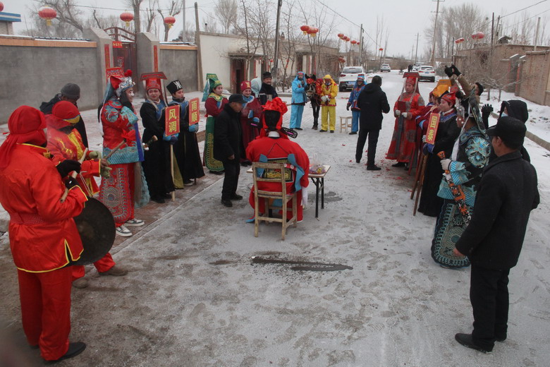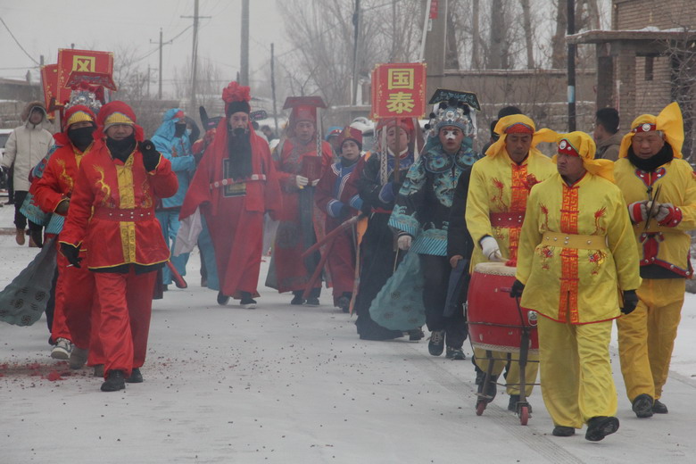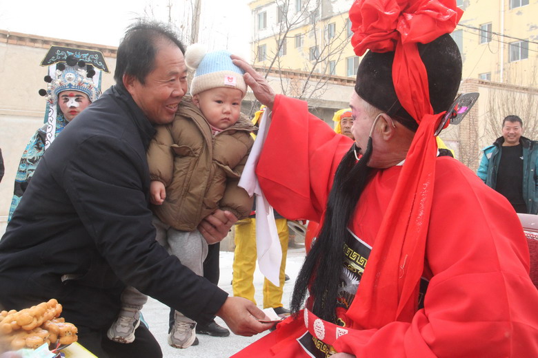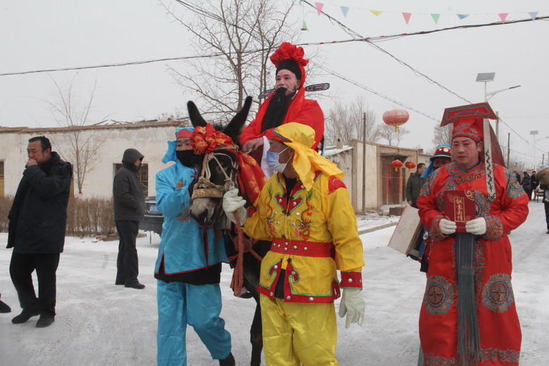 一大早,天空虽然飘起了雪花,但并没有阻挡村民们参加活动的热情。和往年一样,由村民推选的一位德高望重、能说会道的老者,穿官服,戴官帽,扮演“春官老爷”,骑着装扮漂亮的毛驴,在飘飘洒洒的雪花中,20名童子们扮演的衙役鸣锣开道,逐街送福,所到之处,邻里们结伴设宴,鸣炮迎接,辟邪祈福,“春官老爷”下马作揖,焚香祭拜,拂袖掸尘,送上新春的祝福。