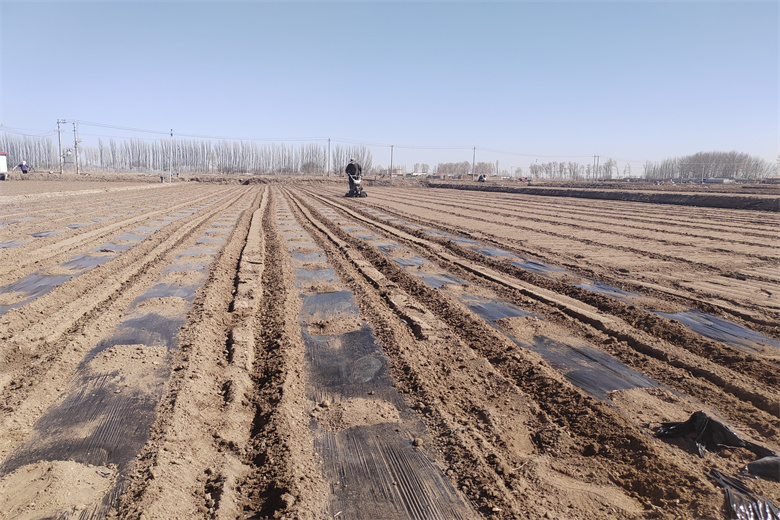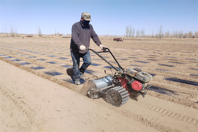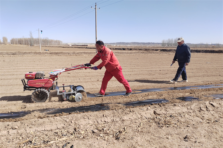 人工覆膜慢,机械覆膜快。如今,一台台现代农业机械,旋耕整地、覆膜压土,往来穿梭在田间地头,成为春节覆膜的“主力军”。“以前一个人拉铺膜机,两个人要紧随其后往两侧覆土压实,一天下来只能铺三四亩地,耗时耗力,现在不一样了,一个人铺摸也没问题,农业机械化为种植户既省了心又省了力。”一社村名张开全一边说一边推着覆膜机到了地头,他熟练地取下铁锨,切断地膜,铲起土压住断头。